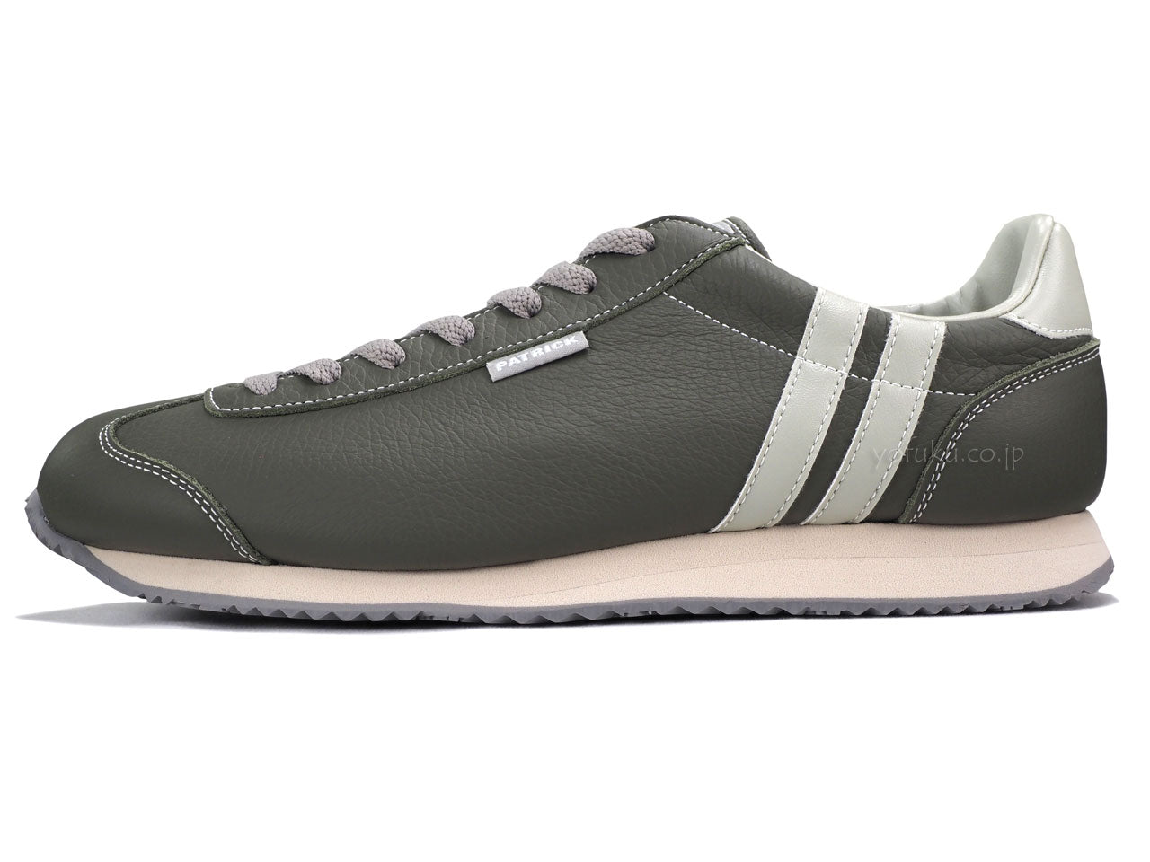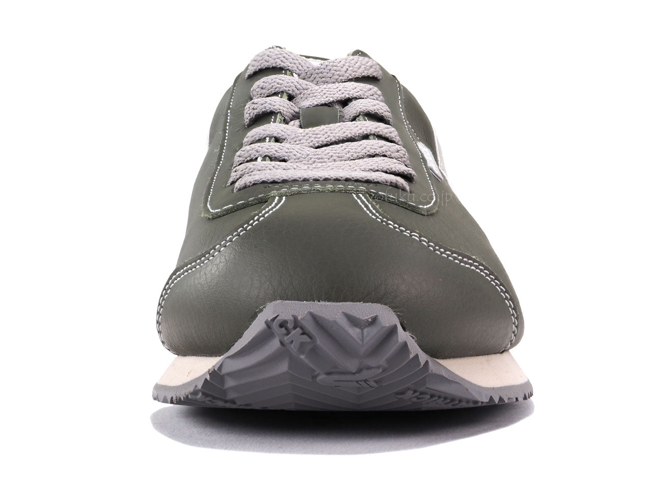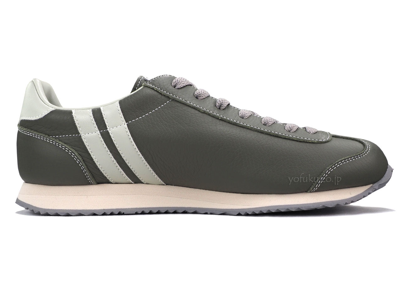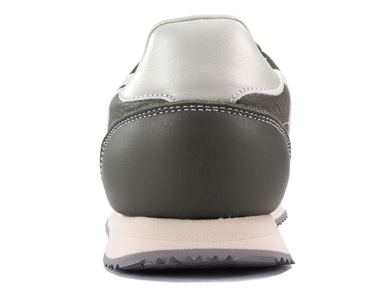 モスグリーンのアッパーに淡いミントグリーンのラインと履き口、かかと周り。グレーのシューレース。サンドベージュのミッドソール、ライトグレーのアウトソール。限定生産カラーです。