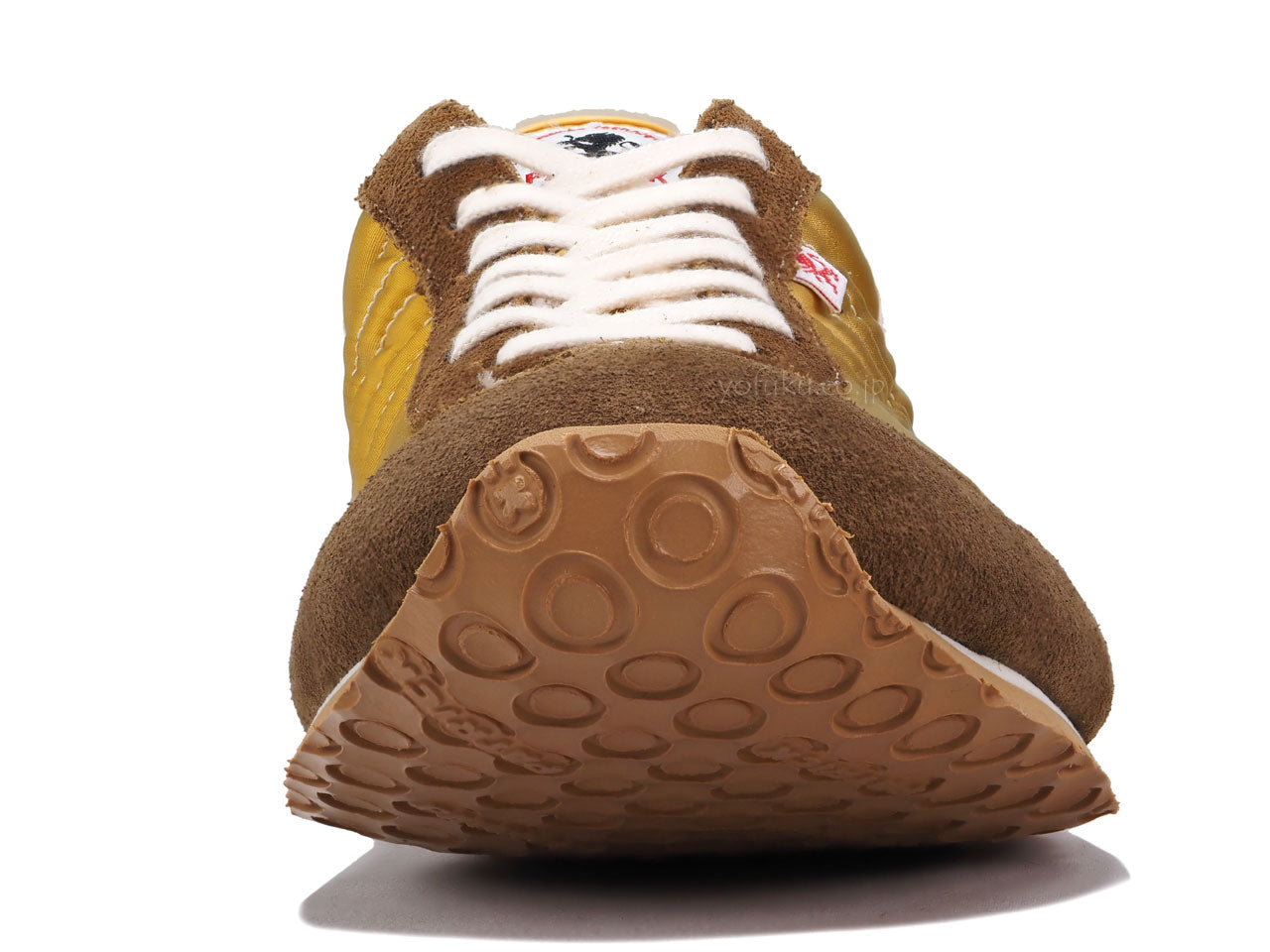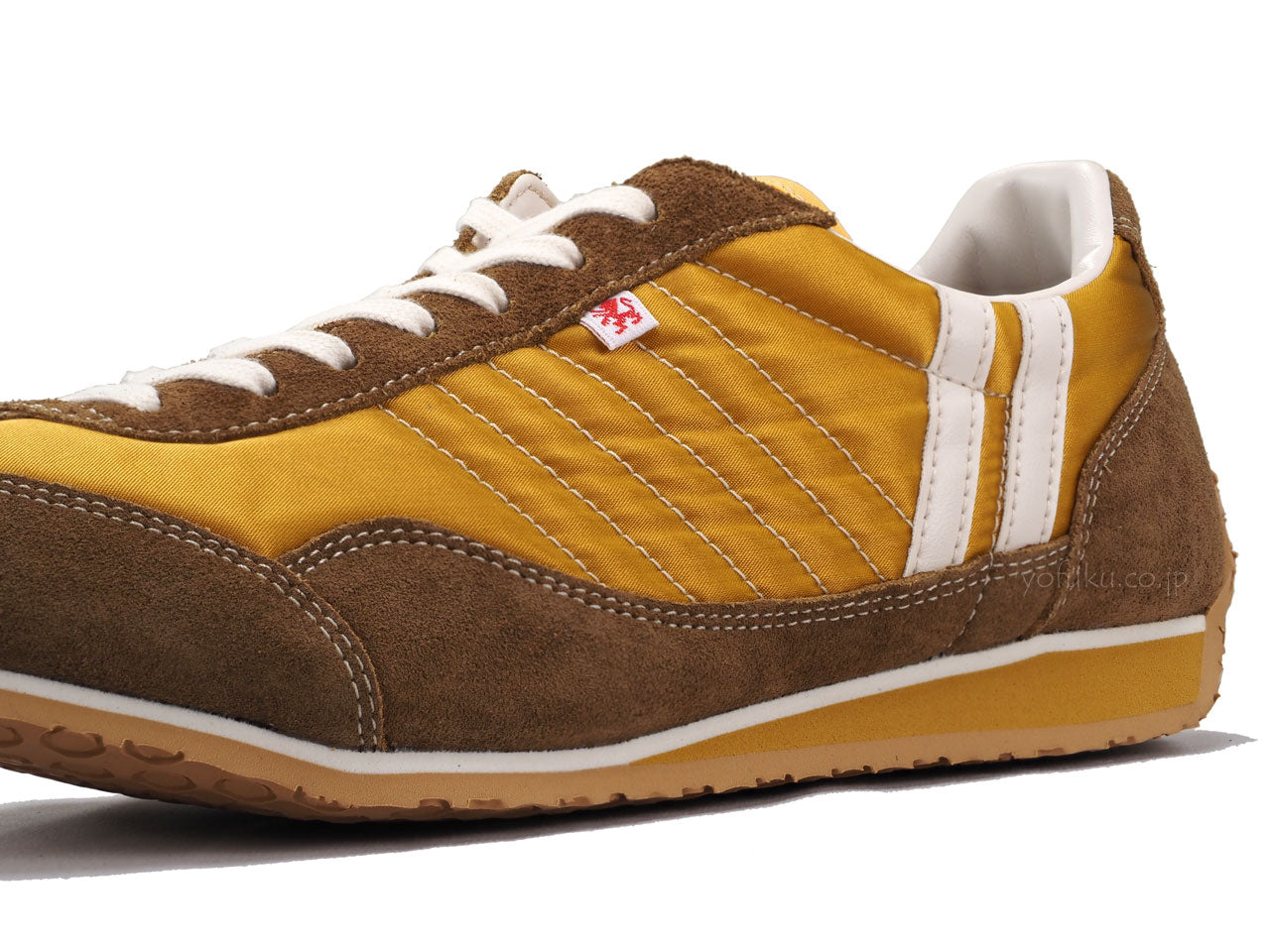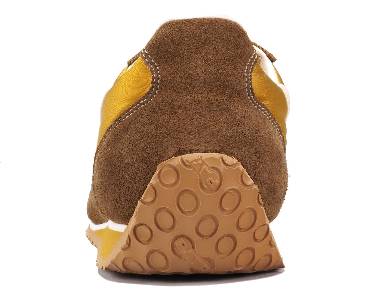 光線の加減で色合いが濃淡に変化する光沢感あるマスタードイエローのアッパーにキャメルベージュのベロア、ナチュラルのシューレース、オフホワイトのラインと履き口。オフホワイトとマスタードイエローのミッドソール、ナチュラルのアウトソール。限定生産カラーです。