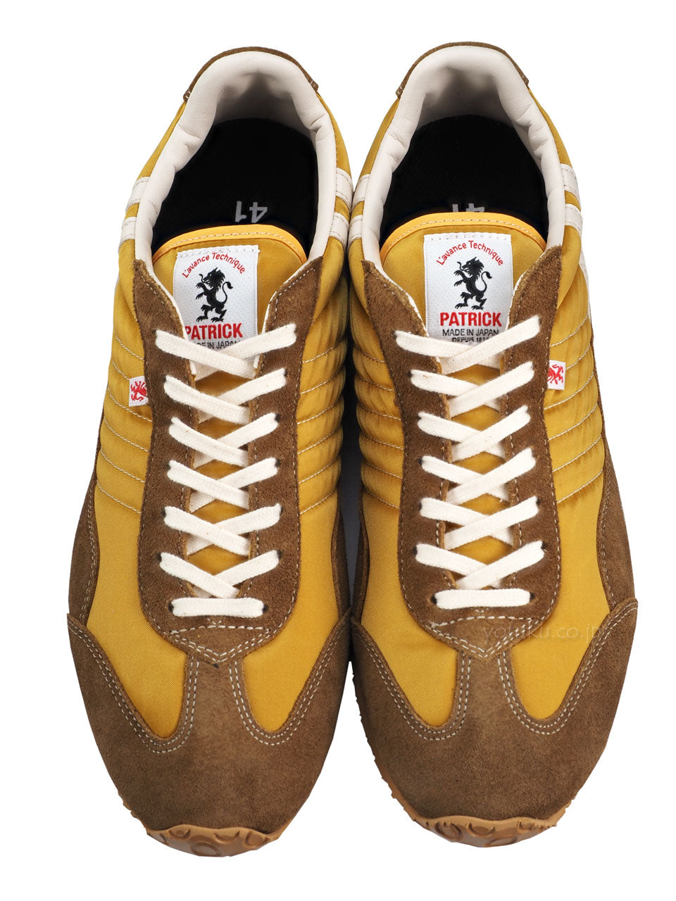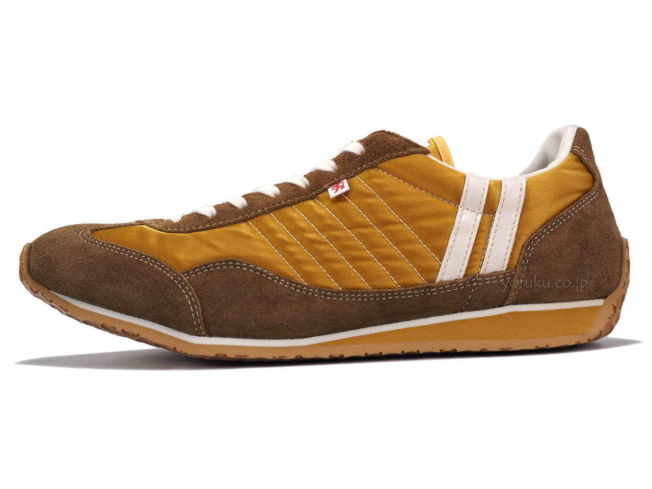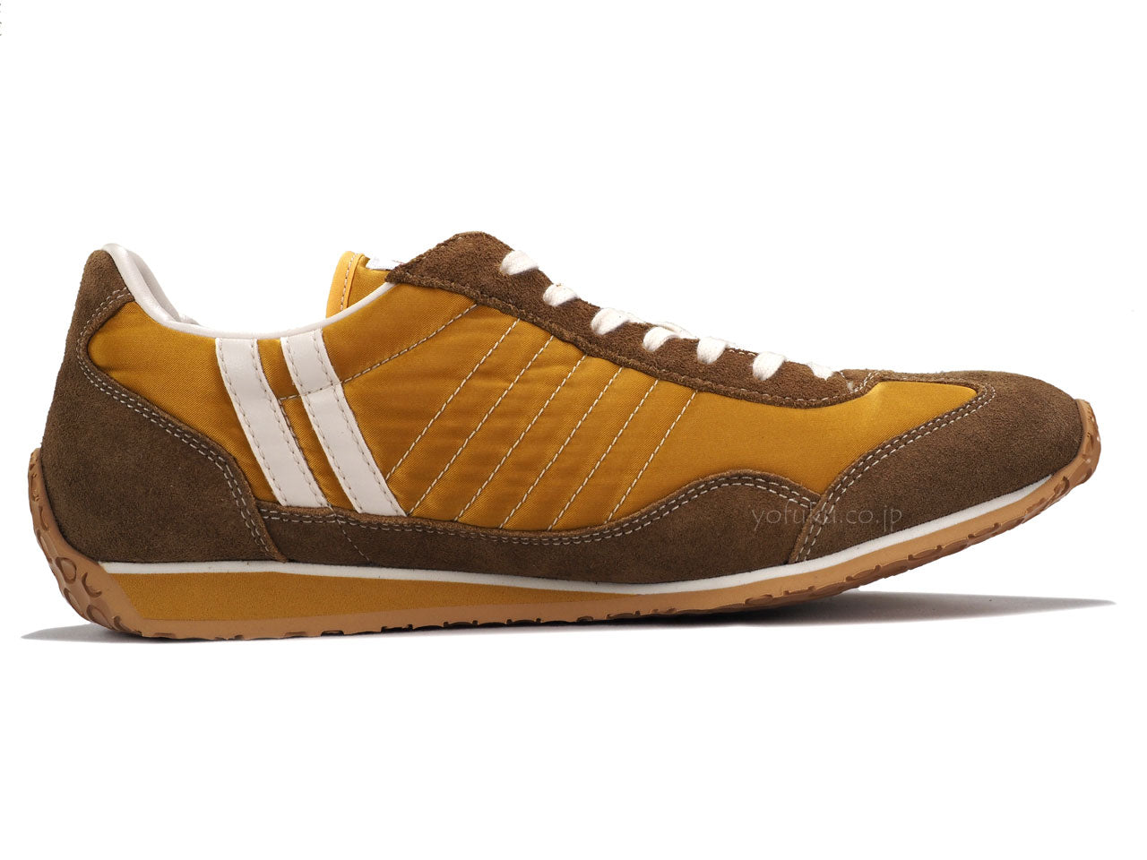 光線の加減で色合いが濃淡に変化する光沢感あるマスタードイエローのアッパーにキャメルベージュのベロア、ナチュラルのシューレース、オフホワイトのラインと履き口。オフホワイトとマスタードイエローのミッドソール、ナチュラルのアウトソール。限定生産カラーです。