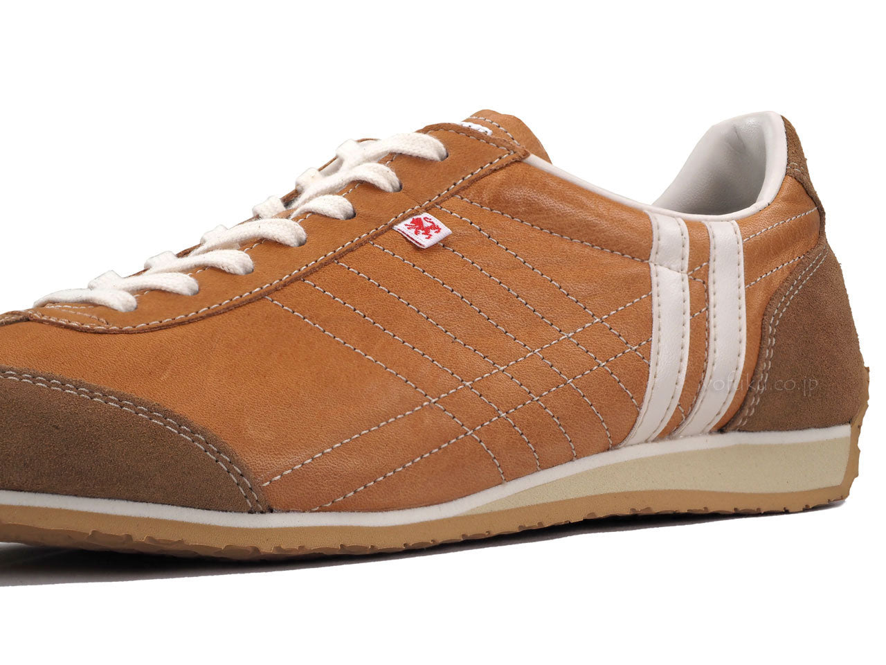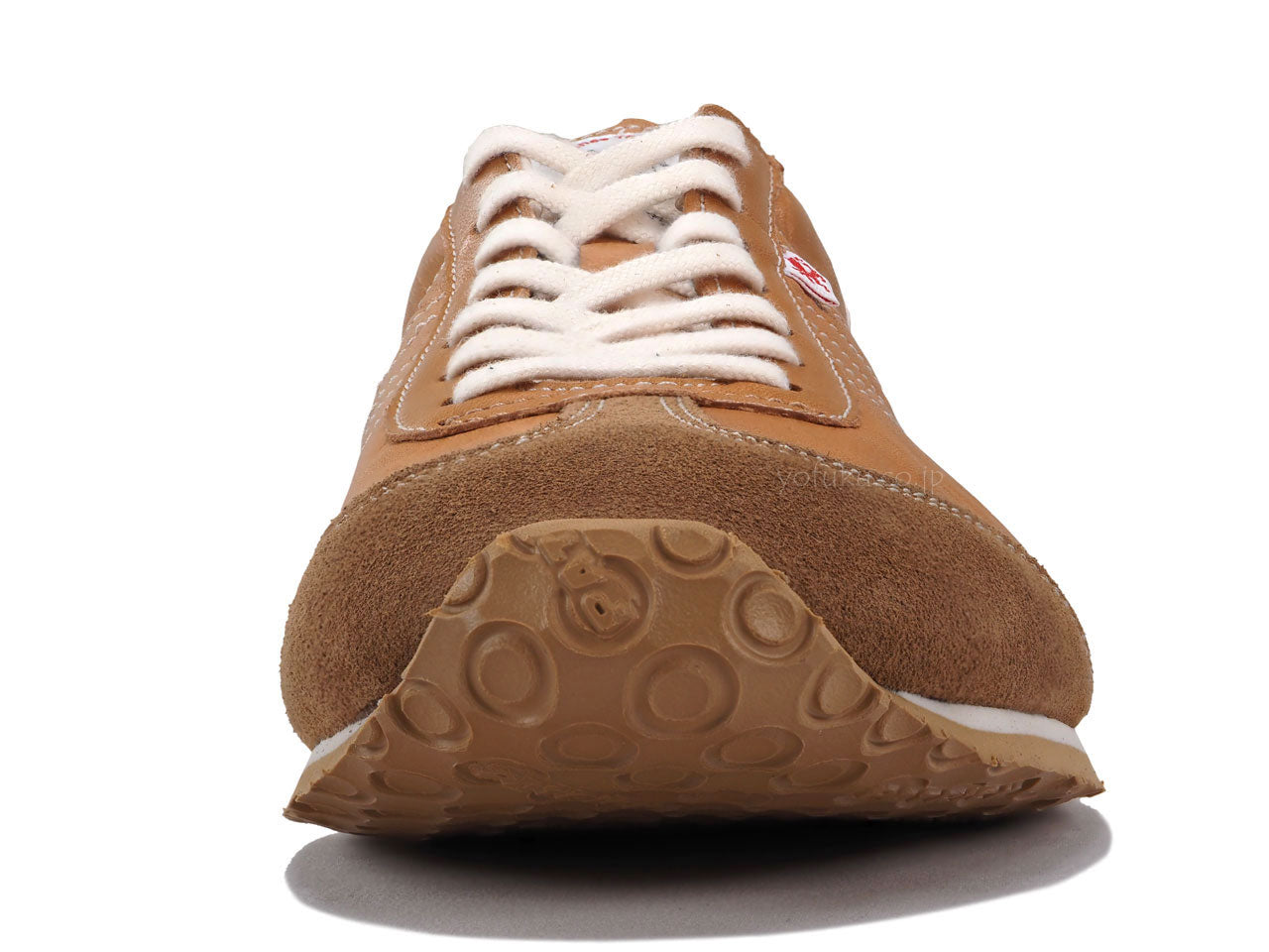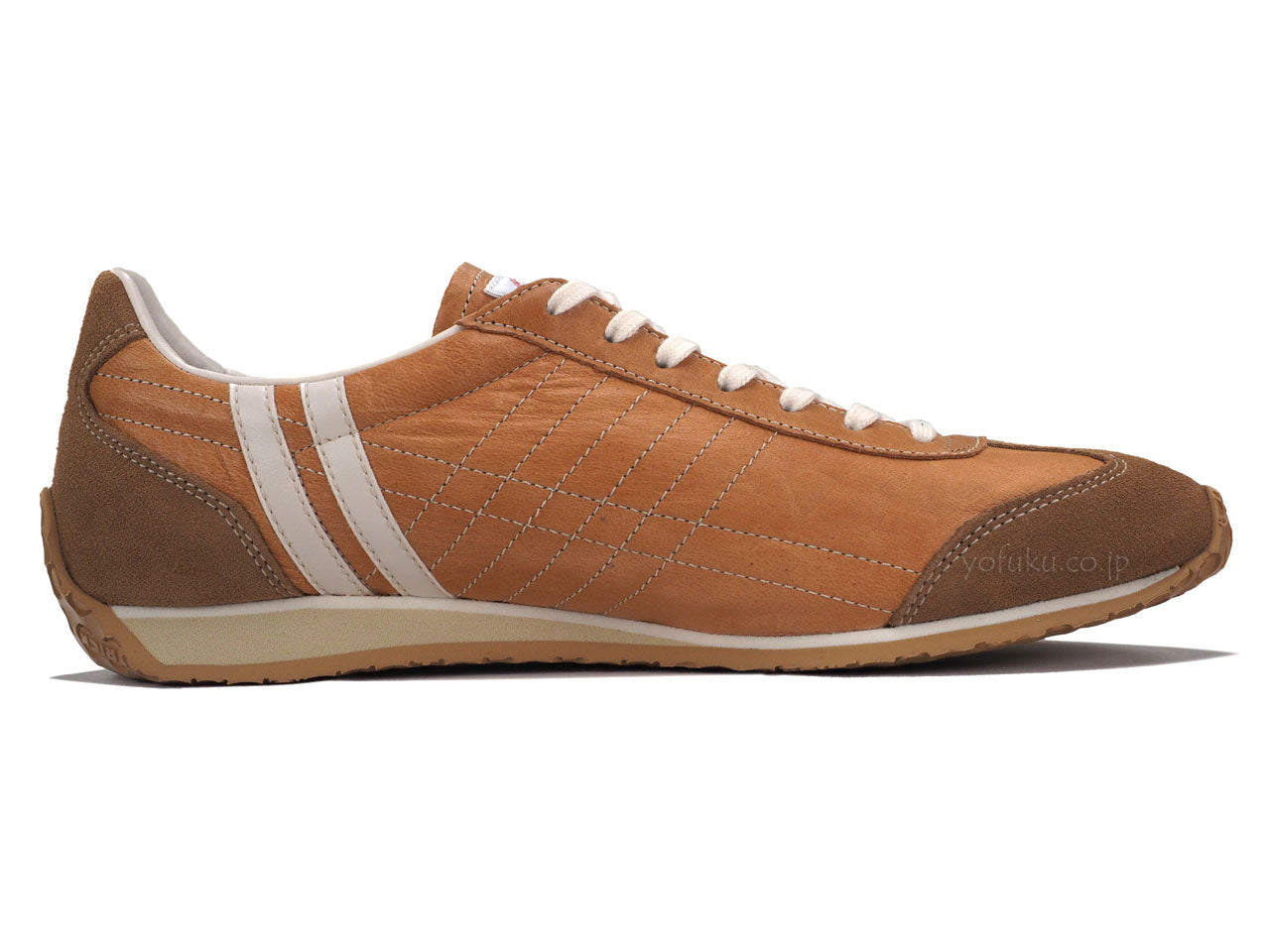 程よいツヤ感があるキャメルブラウンのアッパーに同色系キャメルブラウンのベロア、オフホワイトのラインと履き口、ナチュラルのシューレース、サンドベージュのミッドソール、ナチュラルのアウトソール。