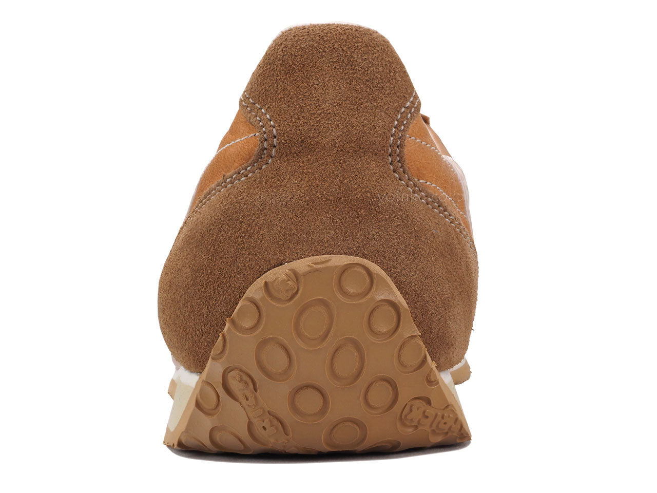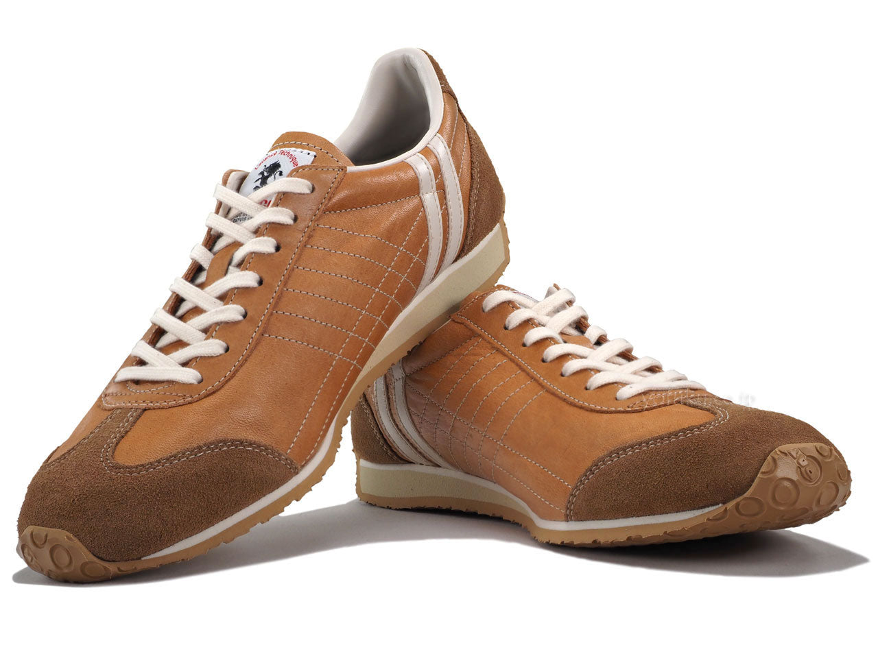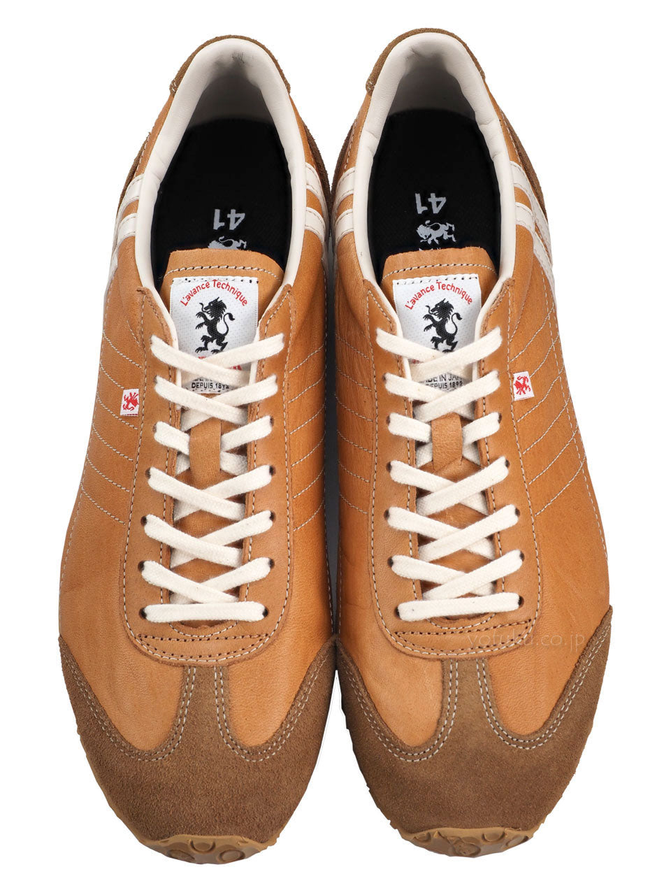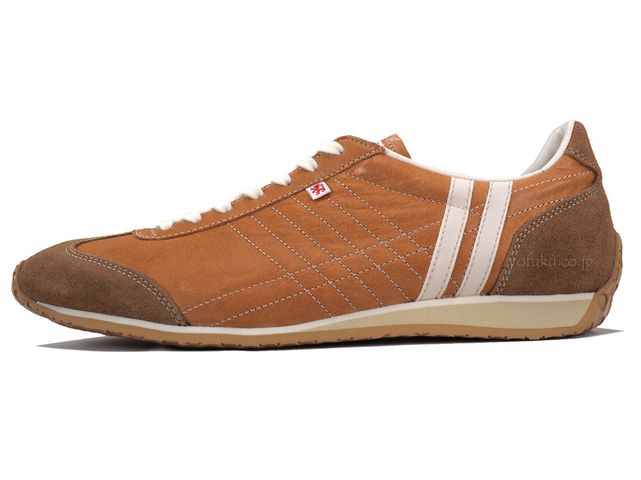 程よいツヤ感があるキャメルブラウンのアッパーに同色系キャメルブラウンのベロア、オフホワイトのラインと履き口、ナチュラルのシューレース、サンドベージュのミッドソール、ナチュラルのアウトソール。