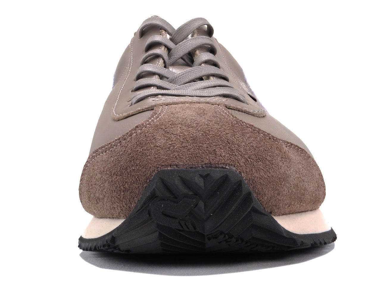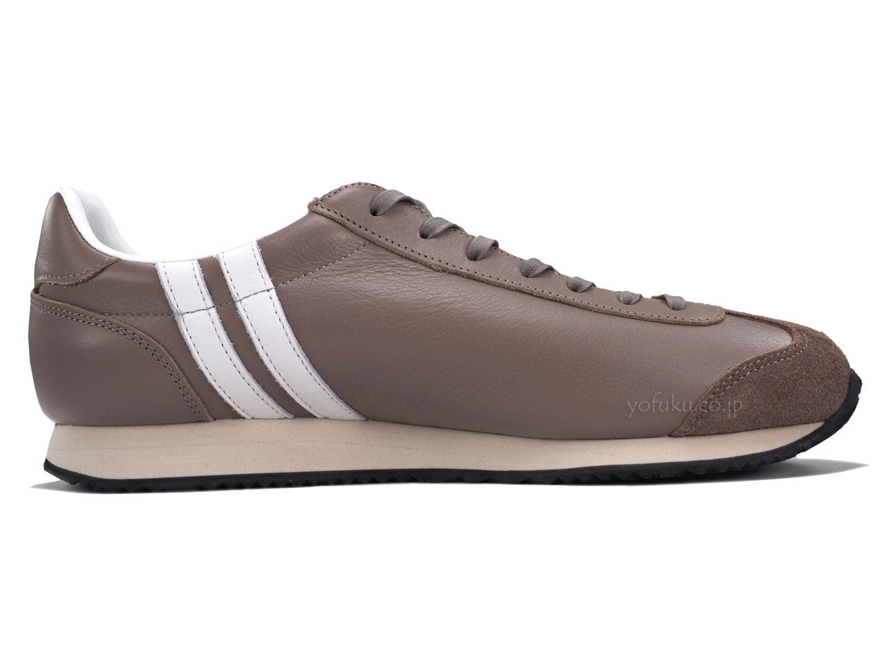 モカブラウンのアッパーに同色のベロアとシューレース。アッパーと同素材のホワイトのライン、ホワイトの履き口、サンドベージュのミッドソールにブラックのアウトソール。