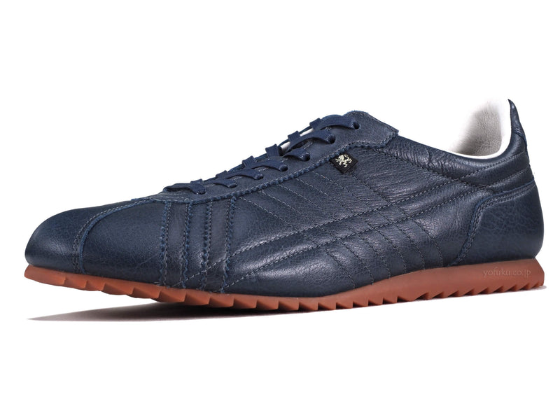 ネイビーのアッパー、シューレース、ライン。シルバーグレーの履き口にナチュラルゴムのソール。