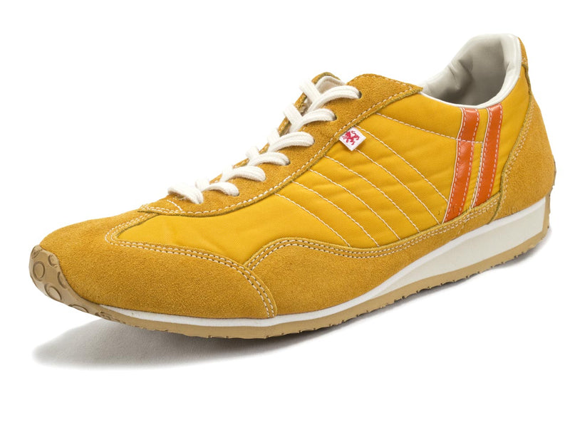 Turmeric-colored upper and velour, natural shoelaces, orange lines, sand beige and off-white midsole, natural collar and outsole combination.