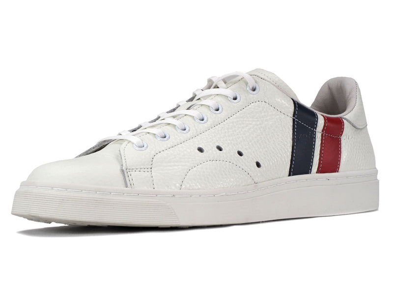 Off-white upper and cuff, white brazed laces, white sole. Red and navy lines.