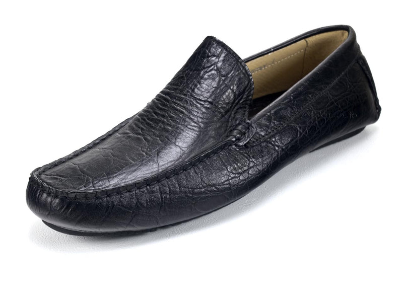 A moccasin type made of glossy steer leather with crocodile embossing.
