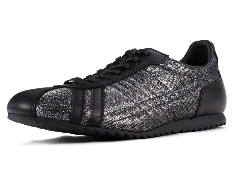 Black and silver lame upper with black leather, laces, pig leather footwear and outsole.