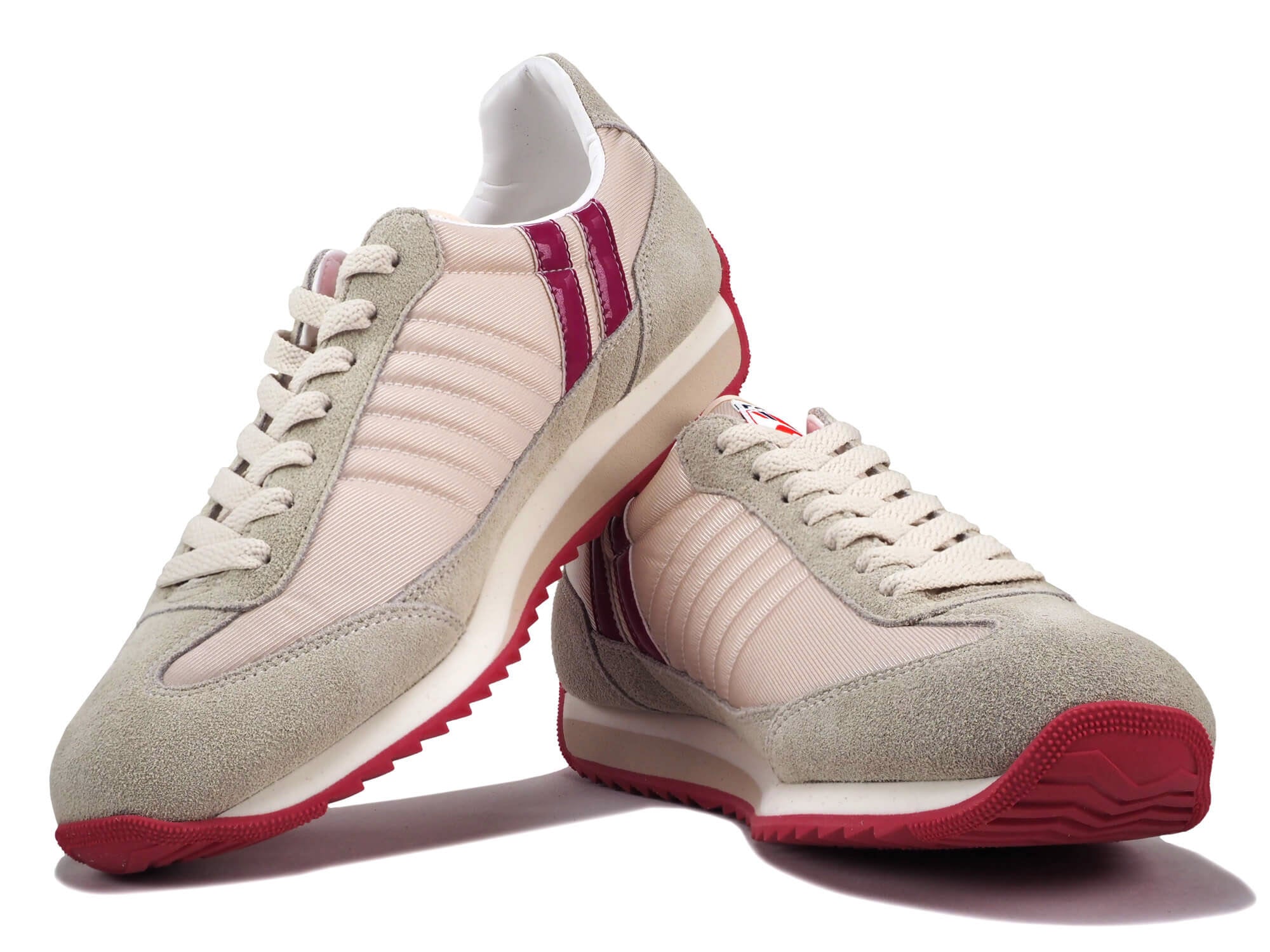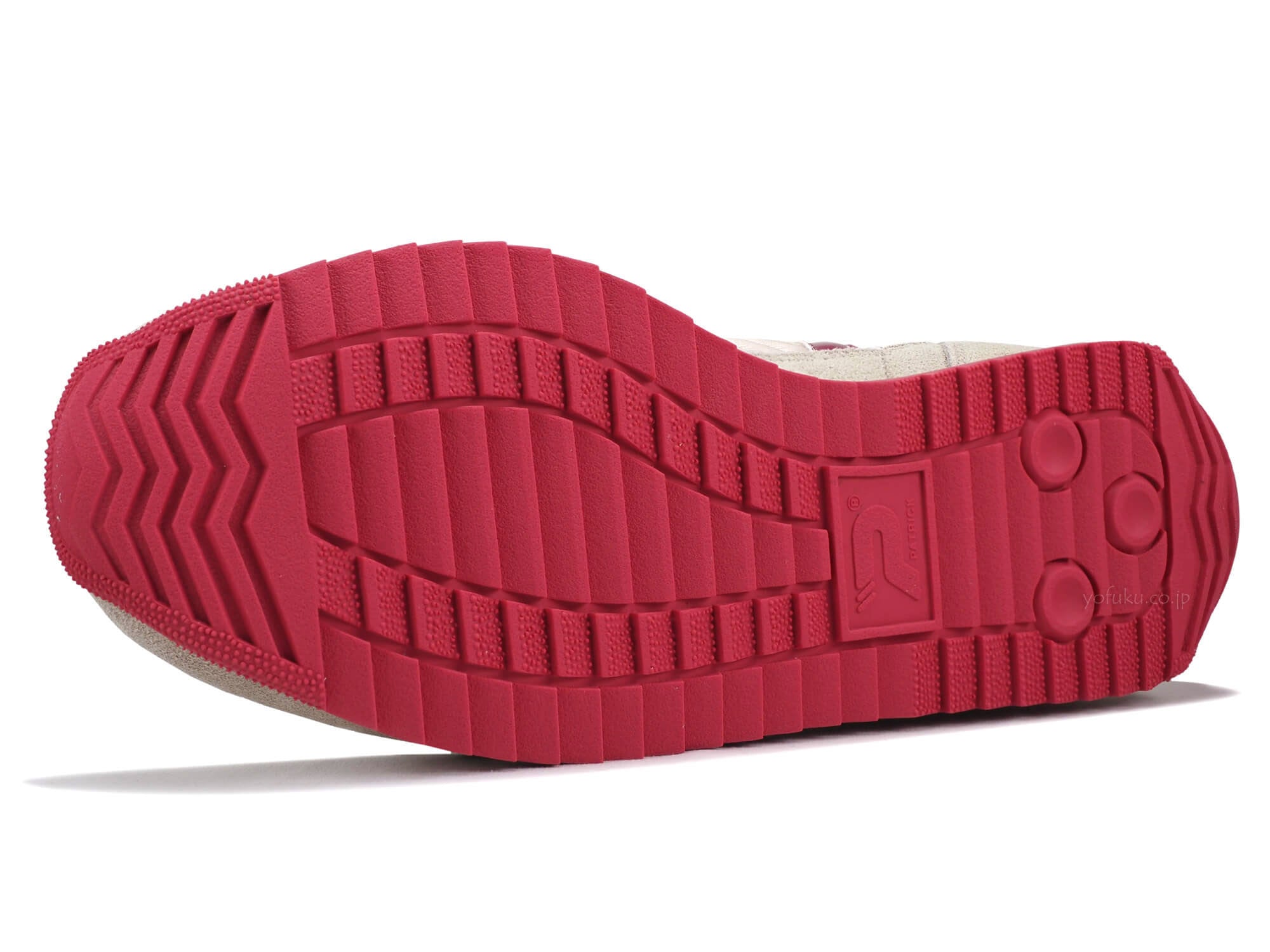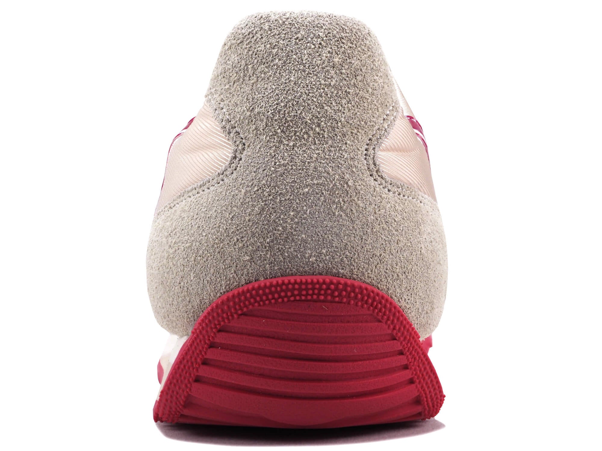The Pêche (peach in French) has a shiny pale beige upper, beige velour, natural laces and plum-coloured enamel lines. Off-white and sand beige midsole. Coral pink outsole. White footwear opening. Limited production colours.
