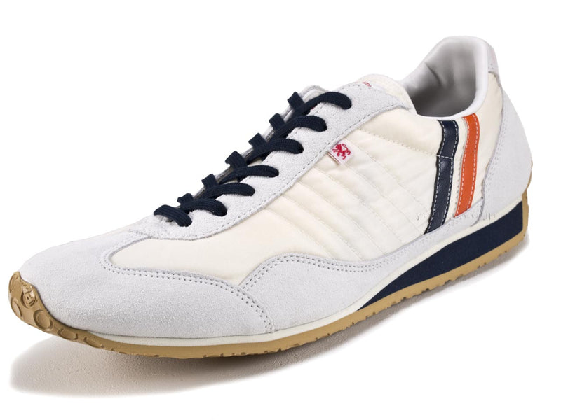 Crane (crane) has a glossy off-white upper with silver gray velor. Navy shoelaces, navy and vermillion red lines, off-white and navy midsoles, and natural outsoles. Off-white collar. Limited production color.