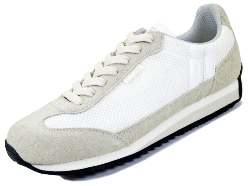 白色網眼鞋面搭配天然絨面革和鞋帶。灰白色線。米白色和沙米色中底搭配黑色外底。淺灰色網眼衣領。限量生產顏色。