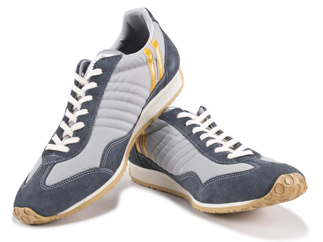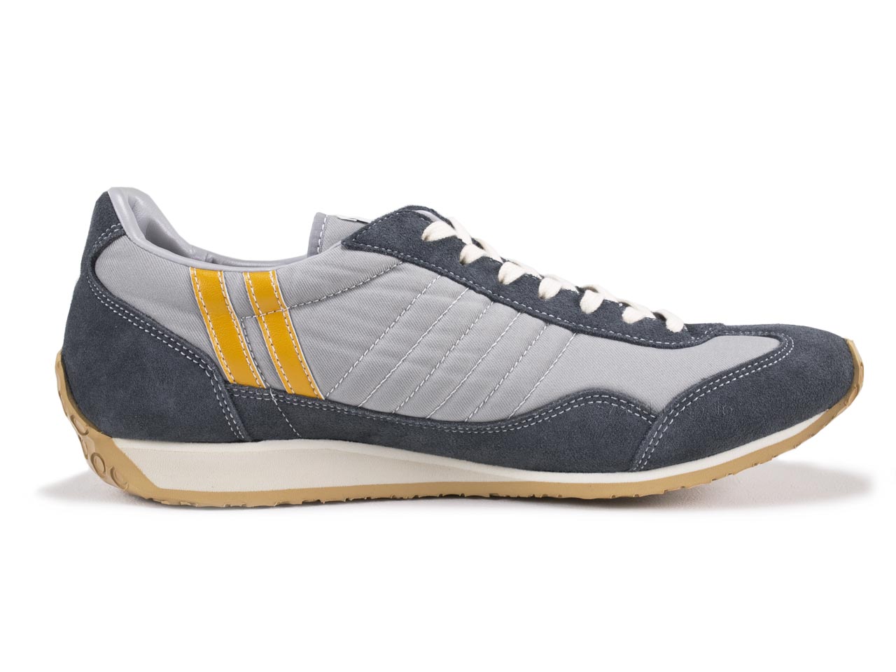 海獅的鞋面為淺灰色,帶有藍灰色絲絨。天然花邊。亮黃線。灰色的鞋子。灰白色和沙米色中底和自然色外底的組合。限量生產顏色。