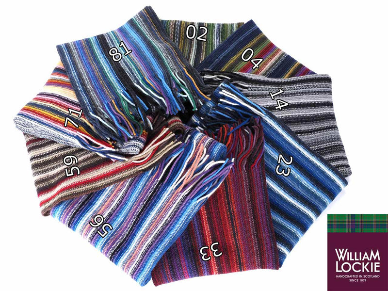 這款多色條紋針織圍巾採用 100% 柔軟蓬鬆的羊羔毛製成,不易引起皮膚搔癢。本產品由蘇格蘭針織品公司 William Lockie 生產,該公司成立於 1874 年。